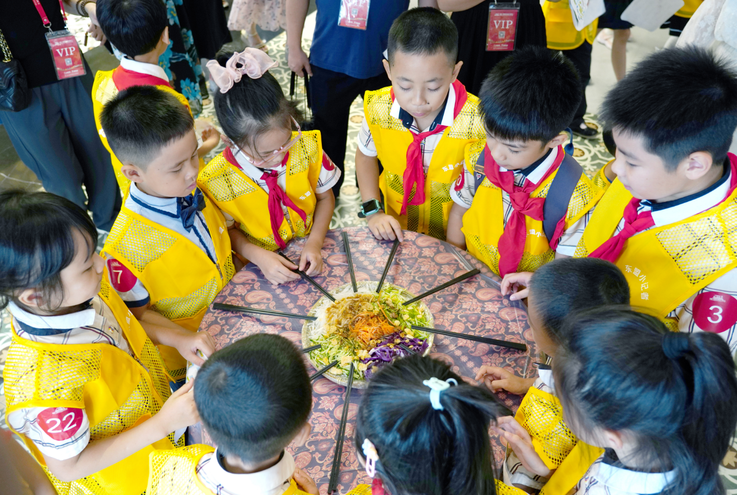 在馬來(lái)西亞館,東盟“小記者”們在現場(chǎng)親身體驗了地道的東南亞華人傳統習俗——“撈生”儀式,即把裝在盤(pán)子里的食材用筷子反復高高夾起,“撈”得越高,寓意越吉祥。通過(guò)趣味“撈生”,寄語(yǔ)孩子們學(xué)習更上一層樓、德智體美勞全面發(fā)展的美好愿望。