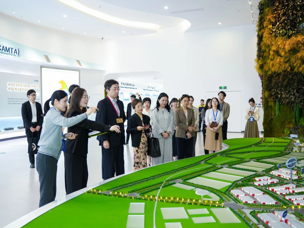 在中新物流園展廳,代表團詳細了解園區的整體規劃和發(fā)展情況,對國際陸海貿易新通道的戰略?xún)r(jià)值以及廣西作為關(guān)鍵節點(diǎn)的樞紐作用有了更深刻的理解。代表團對于園區選址于廣西南寧,既把握了中國西部大開(kāi)發(fā)的戰略機遇,又充分發(fā)揮了廣西面向東盟的區位優(yōu)勢,實(shí)現多方共贏(yíng)發(fā)展格局表示了贊賞。