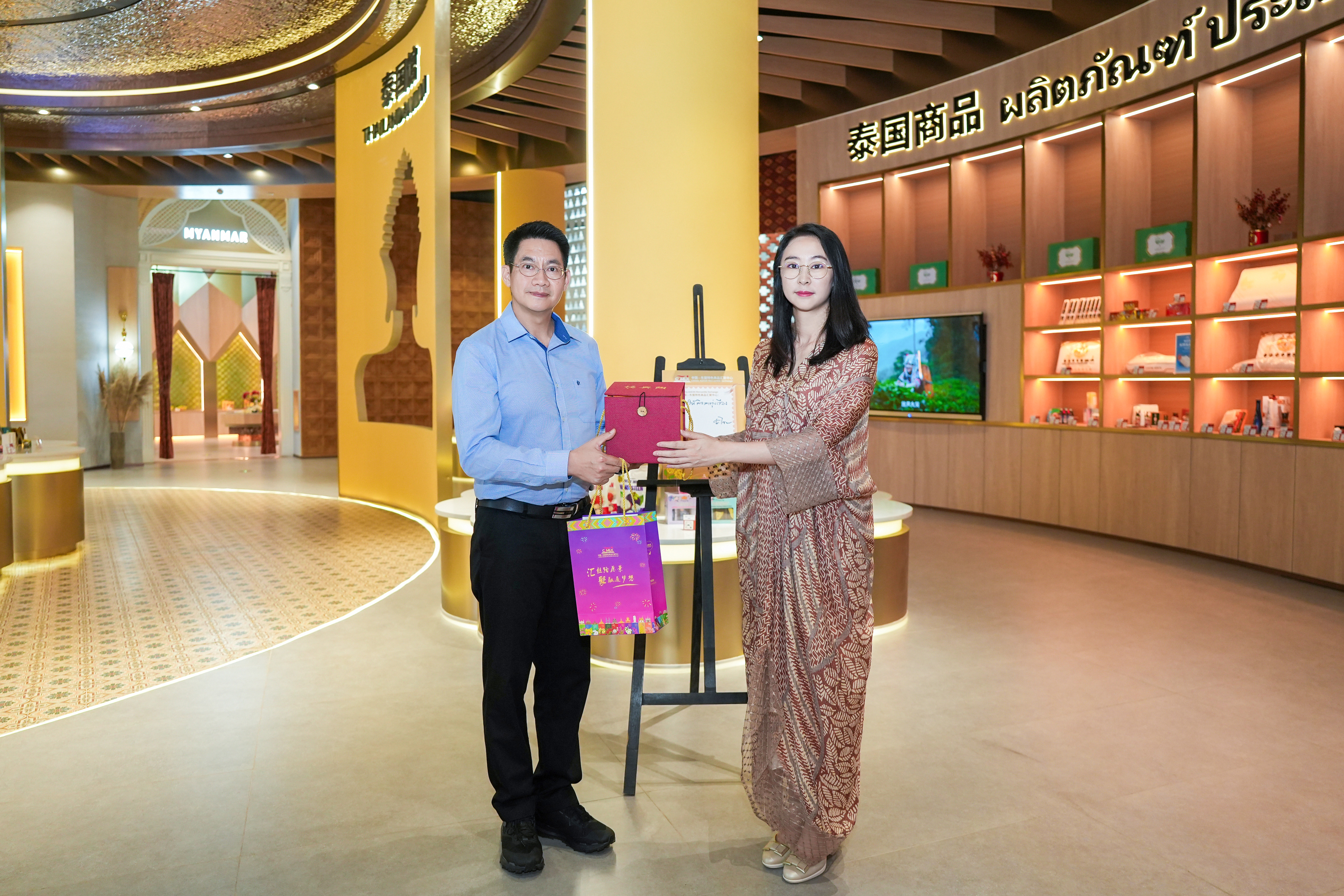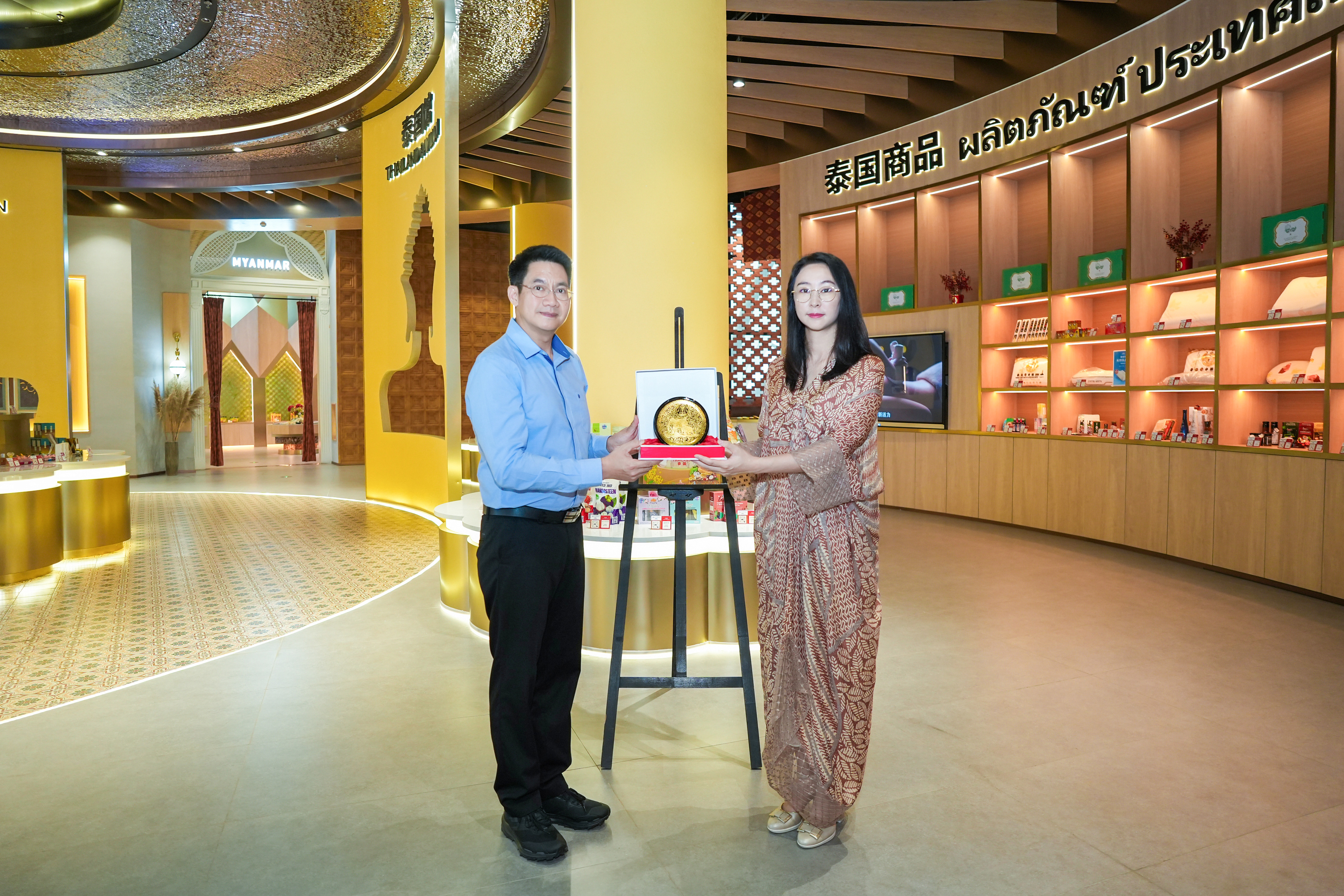 步入泰國館,館內琳瑯滿(mǎn)目的商品及當地各種特色文化元素的創(chuàng )意呈現,讓代表團產(chǎn)生了濃厚的興趣。在了解到匯聚中心為入駐商家提供一站式增值服務(wù),特別是聽(tīng)取了各館長(cháng)對商品專(zhuān)業(yè)的介紹后,代表團對平臺的發(fā)展更添信心。“這是一個(gè)真正為商家服務(wù)并獨具特色的商貿平臺,很開(kāi)心能在這里看到很多泰北特色商品,泰北的清邁、清萊和蘭納地區擁有非常豐富的手工藝品,如咖啡、陶瓷、木雕、雨傘、燈籠等,希望能在匯聚中心設立泰北特色商品專(zhuān)區,借助匯聚中心這一平臺幫助當地特色商品擴大品牌影響力,拓寬國際市場(chǎng)”。代表團興致高漲,隨即就商品入駐流程與后續營(yíng)銷(xiāo)推廣細節,與匯聚中心團隊展開(kāi)積極溝通。